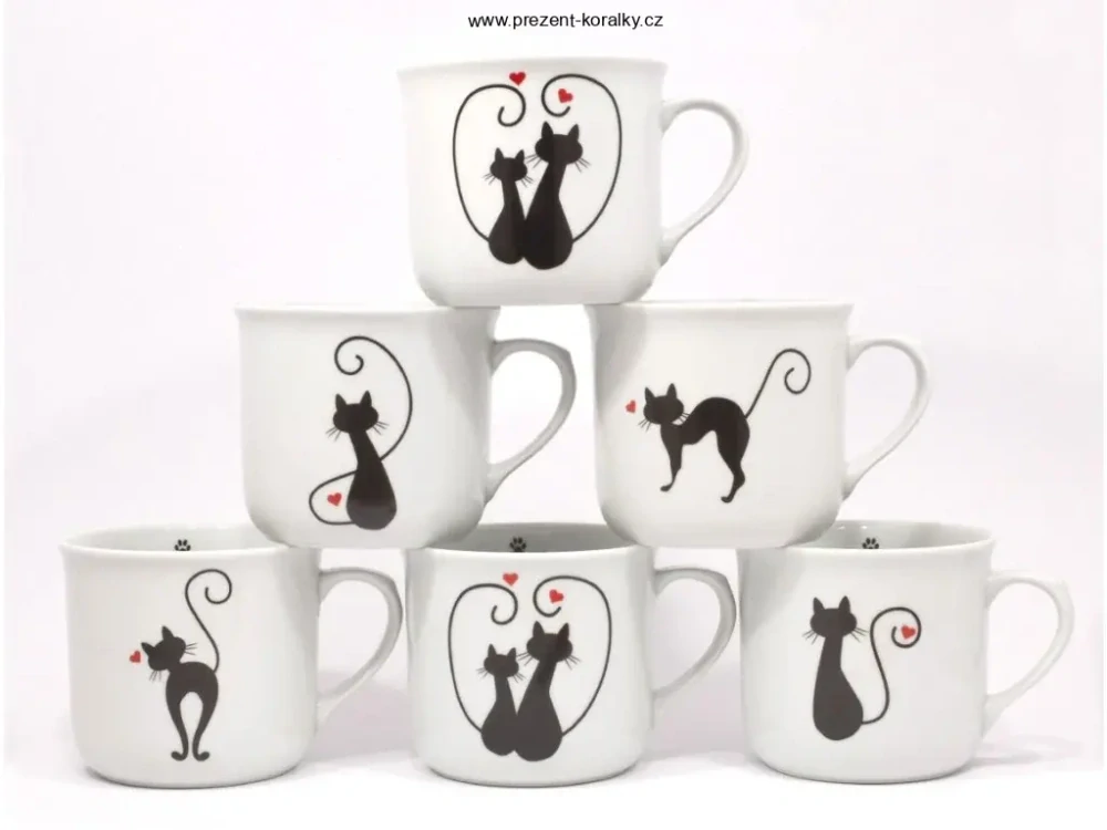 Porcelánový hrnek s motivem koček je vyrobený v české porcelánce. Hrnek s kočkami má objem 650 ml, výška je 10 cm, průměr 11,5 cm. Hrnek je vhodný do myčky, do mikrovlnné trouby i na kamna. Do poznámky napište jakou variantu chcete.
