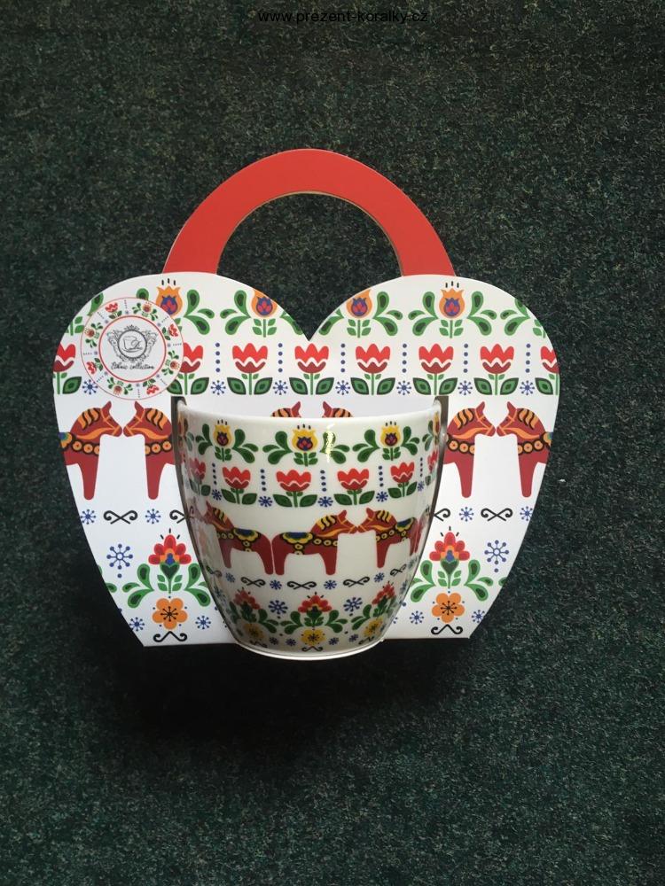 Porcelánový hrnek bílé barvy s motivy jarnách květin a koně o objemu 460 ml, výška je 9,5 cm a průměr hrnečku je 10,2 cm. Dodáváme v dárkové tašce. Hrnek s veselým motivem je vhodný pro myčky a mikrovlnné trouby.